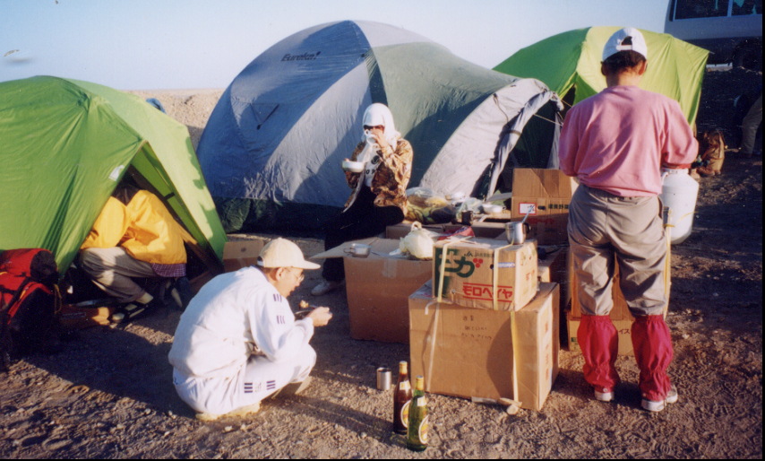 テントの傍で寒い朝食 ラクダさんに食べ物をあげる 野営風景 ラクダ使いさんも夕食準備